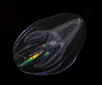 那个彩色东西,并不是因为生物发光(bioluminescence),而是让栉水母能在水中移动的纤毛所散射出来的光。