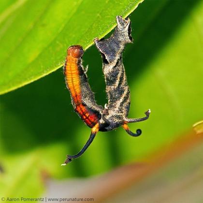 Aaron Pomerantz为生态旅游公司“雨林探险”(RainForest Expeditions)工作,他是在秘鲁东南部坦博帕塔研究中心附近的一棵树上发现这只毛毛虫的,当时他爬到了30米的高度,而毛毛虫正伪装成树枝的模样。