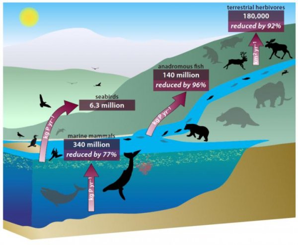 一项新研究显示,过去大型陆生动物、鲸鱼、海鸟和鱼在海洋深处回收养分中扮演着至关重要的角色, 它们将这些养分扩散到全球并带往内陆深处。然而,该研究称这些动物数量的减少已经破坏了这种重要营养物质(尤其是磷)的有效回收系统。研究人员们估算出鲸鱼和陆地动物运输这些营养物质的能力已经减至它们之前的百分之六。完整研究被发表在美国国家科学院院刊上。