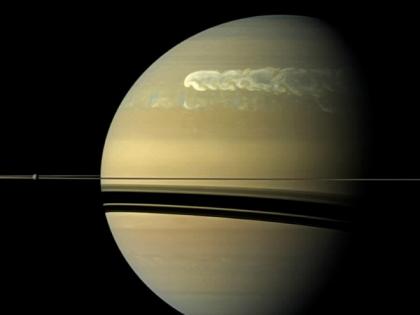 在土星上大约每年——即我们地球的29.5年——都会有一个神秘的大白斑在土星的大气层中爆发,这个大白斑让土星的光环相形见绌。这幅图片显示了大白斑的最后爆发,它始于2010年末,一开始只是北部的一个点,再扩大成一个比地球还要大的带状体。