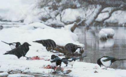 棕熊的盛宴结束后.其他小型动物也分得一些残盖。