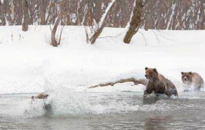 冬天来临,许多动物都进入了冬眠,生活在勘察加半岛的棕熊们也正在为冬眠做着最后的准备。堪察加半岛的库页湖是全球最大的红大马哈鱼繁殖地,每年的七月至次年的三月,大量的红大马哈鱼会溯流而上,来到繁殖地产卵。大量鱼群的到来,让棕熊即使在冬季也能长得膘肥体壮,体内可以贮存大量能量安然冬眠。