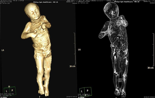 左图扫描画面就有点像医生为孕妇进行的3D断层扫描,考古学家观察出小男孩双唇紧闭,看起来相当惊恐!