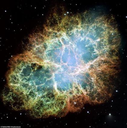 如图所示,这是蟹状星云,是一颗恒星超新星爆炸残骸,其膨胀直径达到6光年。