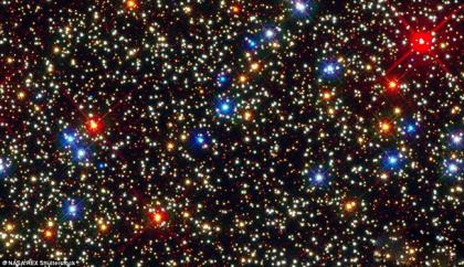 它犹如耀眼的节日灯光,拥挤的恒星位于半人马星座中心区域,这里聚集着大约1000万颗行星。半人马星座包含着大约150个球状星团。