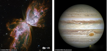 左图是蝴蝶形状的行星星云NGC 6302,它距离地球3800光年;右图是木星超级风暴“大红斑”。