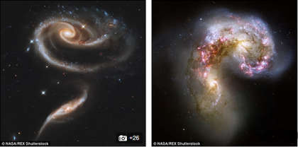 左图是交互星系Arp 273,它是体积较大的螺旋星系,它拥有一个盘状结构,潮汐作用下扭曲成玫瑰花状,其潮汐引力来自于图像下方同伴星系UGC 1813。右侧是正在合并中的触须星系,当前正处于碰撞过程中,数十亿颗恒星形成。