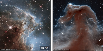 左图是红外线下恒星孕育动荡区域,距离地球6400光年;右图是马头星云的标志性图像,像一个幽灵从星际泡沫中升起。
