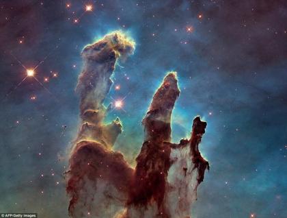 1990年4月24日成功发射升空的哈勃太空望远镜,目前即将迎来它的25岁生日。在哈勃望远镜服役期间,拍摄了大量太空图片,为太空科学研究提供重要资料。目前,美国宇航局发布了它发射以来最具代表性的太空图片。如图所示,这是天鹰星云中的“创造之柱”。