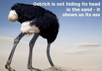 鸵鸟把头埋进沙中:鸵鸟是已知最大的鸟类,它能够以40英里每小时(约64公里每小时)的速度飞奔。但是它不会把头埋进沙中作为一种防御方式。当面临威胁的时候,它们会匍匐在地上进行躲避。当它们从地上起来时,它们的头从远处看就像埋进了沙中。