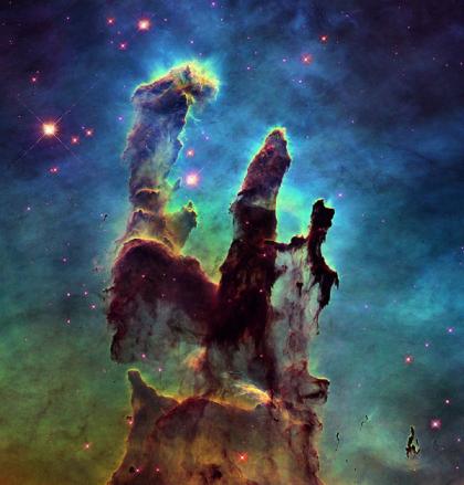 现在我们看到的是充斥着大量冰冷气体并不断挥发着尘埃的恒星摇篮——鹰状星云。这高耸的“塔”有9.5光年或者57,000,000,000,000海里高,大约是太阳与它最近恒星间距离的两倍。
