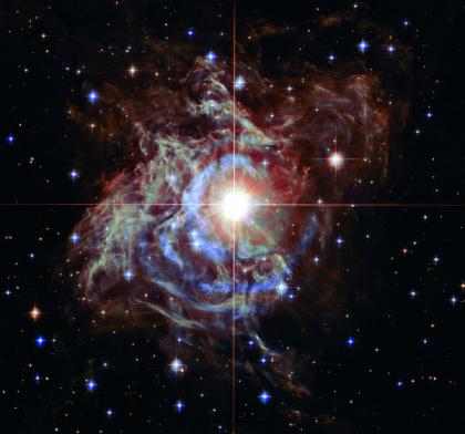 船尾座 RS星,是南半球天空上一颗明星,就是图片中央那颗。嵌在尘埃中的它将周围的尘埃都照得通亮。这颗超级恒星质量是太阳的10倍而体积是太阳的200倍。它以四十多天为周期有节奏的明暗变化着。