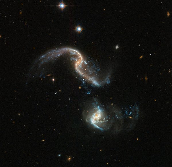 这两个螺旋星系位于鲸鱼座,距离地球3.5亿光年,两者合称为Arp 256。透过NASA的哈伯太空望远镜(Hubble Space Telescope),人们得以观察到这两个星系正开始进行合并的壮观景象。