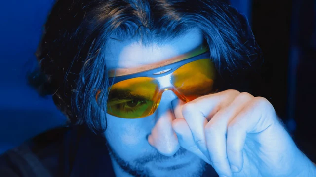我使用的护目镜原本是为激光作业人员设计的。我戴上后望向窗外,街上有一个蓝色霓虹灯招牌——但透过镜片,蓝光完全消失,效果显著。