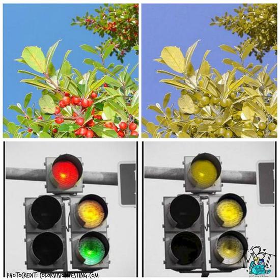 上图左侧为正常人视野,右侧为红绿色盲人的视野