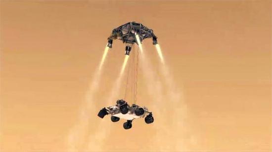 空中吊车释放出尼龙绳,将好奇号火星车吊运到火星表面 对于20年后的载人登陆火星来说,需要运送到火星表面的登陆舱质量更重,不仅需要强大的热保护罩,还需要非常大面积的降落伞,并且把反推火箭动力减速和空中吊车等手段统统用上,实现多种着陆手段的“混搭”,才能确保航天员安全登陆火星表面。目前,作为星座计划核心的战神号货运火箭、载人火箭、猎户座载人飞船均已成功试飞,具备了载人登陆月球、小行星和火星的大部分功能。
