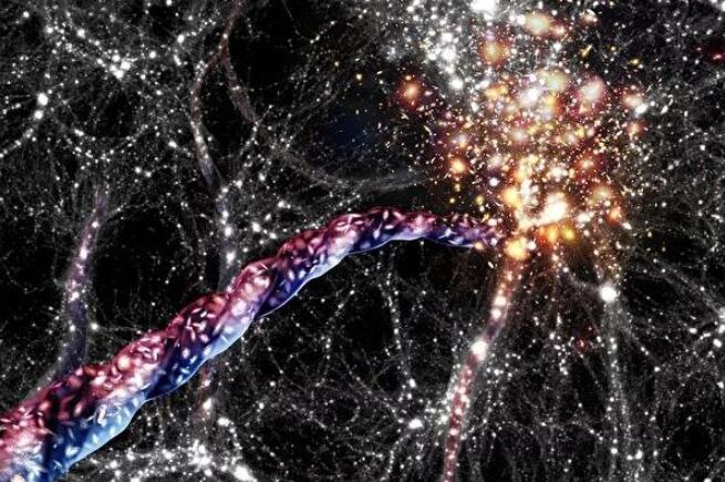 宇宙网内一部分巨大的、长达数十亿光年的脉络结构开始旋转的艺术假想图。(AIP/Khalatyan/Fohlmeister)