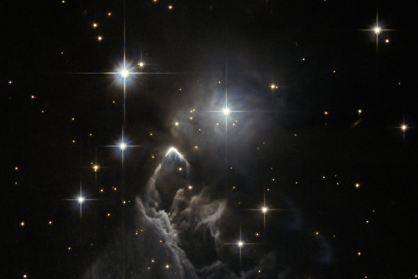 美国国家航空航天局(NASA)拍摄到一个所知不多的模糊星云,其四周有明亮的恒星和黑色尘埃云,还有一个神秘的倒V字型。