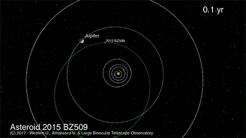 回溯到2015年,虽然这颗直径3公里(1.8英里)的小行星BZ509(或简称’Bee-Zed’)是在通过和木星通过相同的邻近地区(更别说6千颗小行星)时被发现,但只有在最近,一个天文学家团队证实最初的怀疑,它有所谓的逆行轨道(retrograde orbit)。
