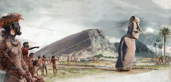 生态灭绝理论如下。他们最初是从现在的玻里尼西亚(Polynesia)划独木舟过来,在公元1200年左右定居在岛上。十八世纪初,大约是欧洲人首次遇到复活节岛居民的时候,大量的森林砍伐已经在进行。