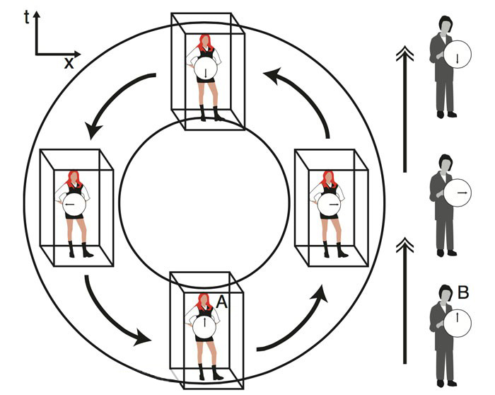 您可以在下面的图片中看到基本想法,一位在气泡/时光机器内的乘客(人员A) 和站在旁边的外部观察者(人员B)。