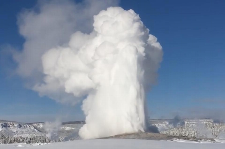 如同美国广播公司(ABC)新闻报导,老忠实喷泉,在黄石国家公园著名的愤怒水柱,正忙着做日常工作。每44到125分钟,它累积足够的压力,把超热的水射到空气中。就在地面下方22公尺(72英尺)处,水温大约为118℃(244°F),而且在它爆发到地面上时,它经常保持这个热度。