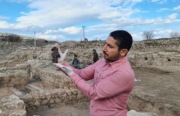 切利克巴斯博士手持这件罗马士兵铁面具碎片。(Ersin Çelikbaş提供)