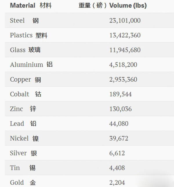根据苹果最近发布的年度环境责任报告,他们回收的材料如下: