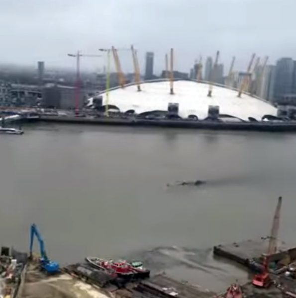 从镜头中可见一神秘庞然大物在泰晤士河“游泳” 。
