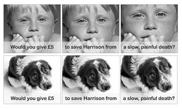 一间英国慈善医学研究机构也支持这种说法,他们设计了两款捐款海报,标语写着:“你愿意捐出5英镑帮助哈里森 (Harrison) ,不让他痛苦又缓慢地死去吗?”两款海报的图片分别是小孩和小狗,结果发现狗狗海报的捐款金额比较多。