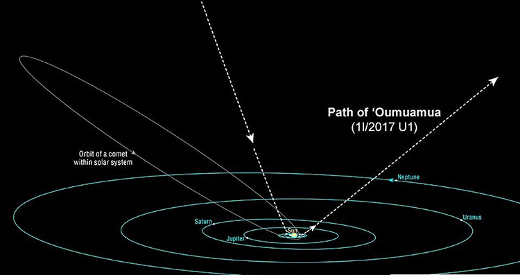 “Oumuamua”没有显示出彗星的特征。 它的颜色偏红,周围没有尘埃,表示它是由密集的岩石和金属组成,被宇宙辐射变红,不含水或冰。