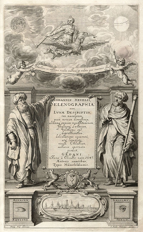一幅耐人寻味的封面画,画中人物是装扮十分类似的海什木(左)与伽利略(右),该书作者则是十七世纪的欧洲学者Johannes Hevelius