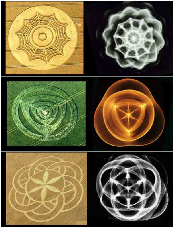 Hans Jenny也提供了麦田圈制作的物理关联,他的照片中有许多振动图样模仿了麦田圈的结构:从1980年代以简单圆形为中心的同心圆的典型图案,到1990年代的四面体与复杂的星状碎形。