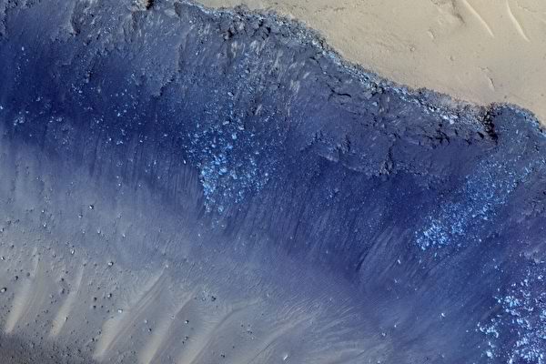 一种是大石块的滑坡,即是照片上浅蓝色的部分,估计这些石块是从接近火星地表的、也是浅蓝色的那个基岩层而来。
