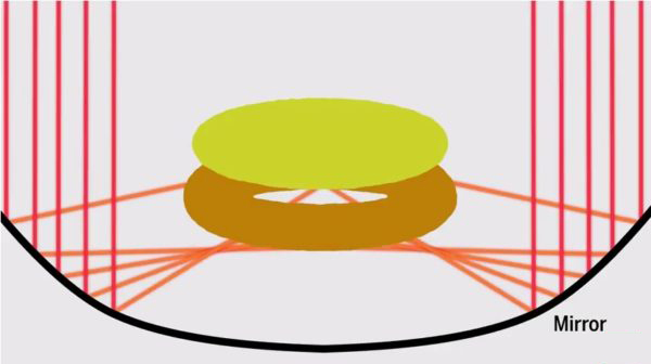 不同于绝大部分生物的眼睛,扇贝的眼睛除了有聚光的晶体,还拥有凹透镜,这些微小的镜子和水晶呈现马赛克状,整齐的排在一个被称为套膜的地方;这些凹透镜能将光线反射进入两个视网膜,一个视网膜可以建立眼睛正前方的影像,另一个则是可以让边缘视角更清楚。