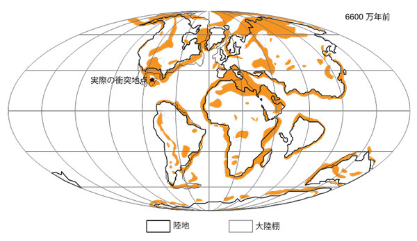 6600万年前,一颗直径10公里小行星撞击墨西哥的犹加敦半岛,撞击让沉积岩中的有机物加热,将地层中的煤和硫化物大量冲上1万米以上的大气层中,导致全球气温急遽冷却,低纬度地区出现干旱,进而让恐龙、菊石等生物灭亡。