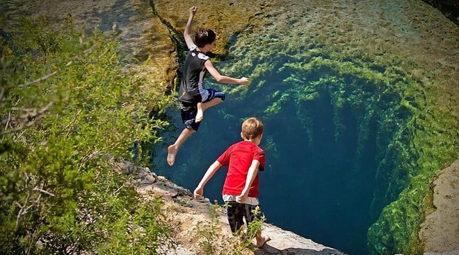 两个男孩看上去像要跳入一个深不见底的黑洞,实际上这是位于美国德州的贾柯布泉,水深9米。