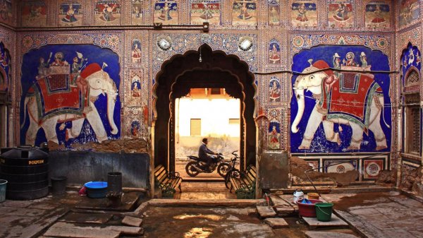 沙卡瓦蒂地区曾经是印度超级富豪的家乡,而这里被遗忘在拉贾斯坦邦的塔尔沙漠贫瘠的土地上。现今,许多富翁的大哈维利斯宅邸都在崩塌,褪色的壁画依稀记录这些遗迹仅存的荣光。