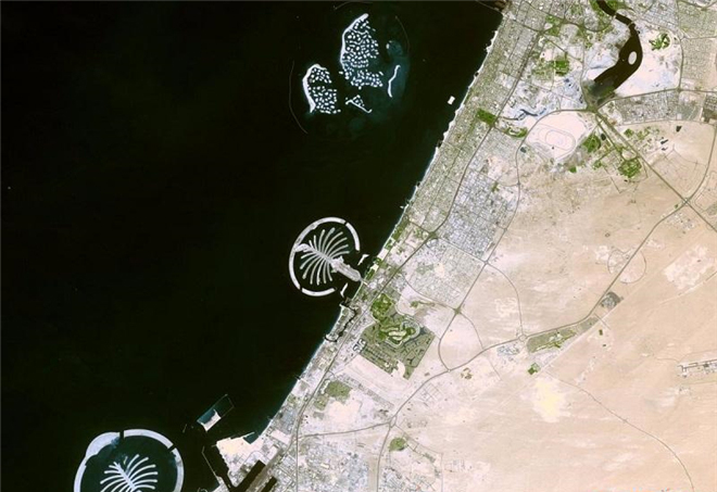 迪拜的棕榈岛:棕榈岛是迪拜海岸的一片人造岛屿,为了建造这片岛屿,工人们从波斯湾的底部挖掘出沙子,并且用这些沙子塑造出岛的形状。部分岛屿的形状建造的酷似棕榈树。这张照片顶部的岛屿仍然在建设当中,它建造时采用了世界地图的形状。