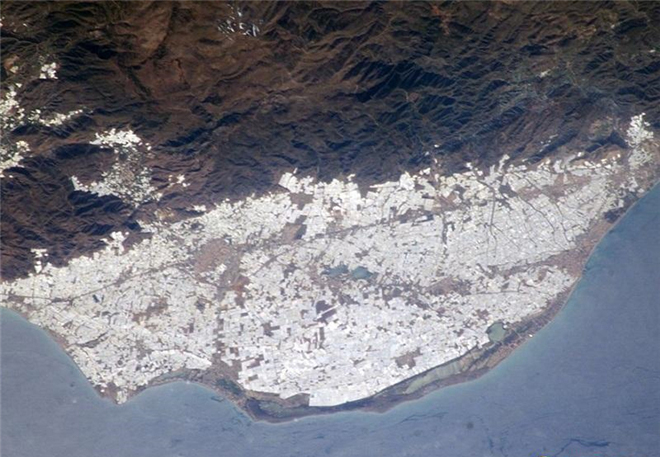 阿尔梅里亚的温室:在西班牙东南部的阿尔梅里亚省,有一片从太空中就看到的温室海洋。这片温室覆盖面积超过6.4万英亩。数百万吨的水果和蔬菜在这里栽种出来并被运送到世界上的其它地区。