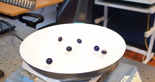 在莱顿弗罗斯特效应的经典例子中,液体浮在远高于液体沸点的受热物体表面上,这就是为什么水滴掠过一个非常热的平底浅锅周围。水滴的底部变成蒸气,是悬浮水滴和热之间的缓冲。