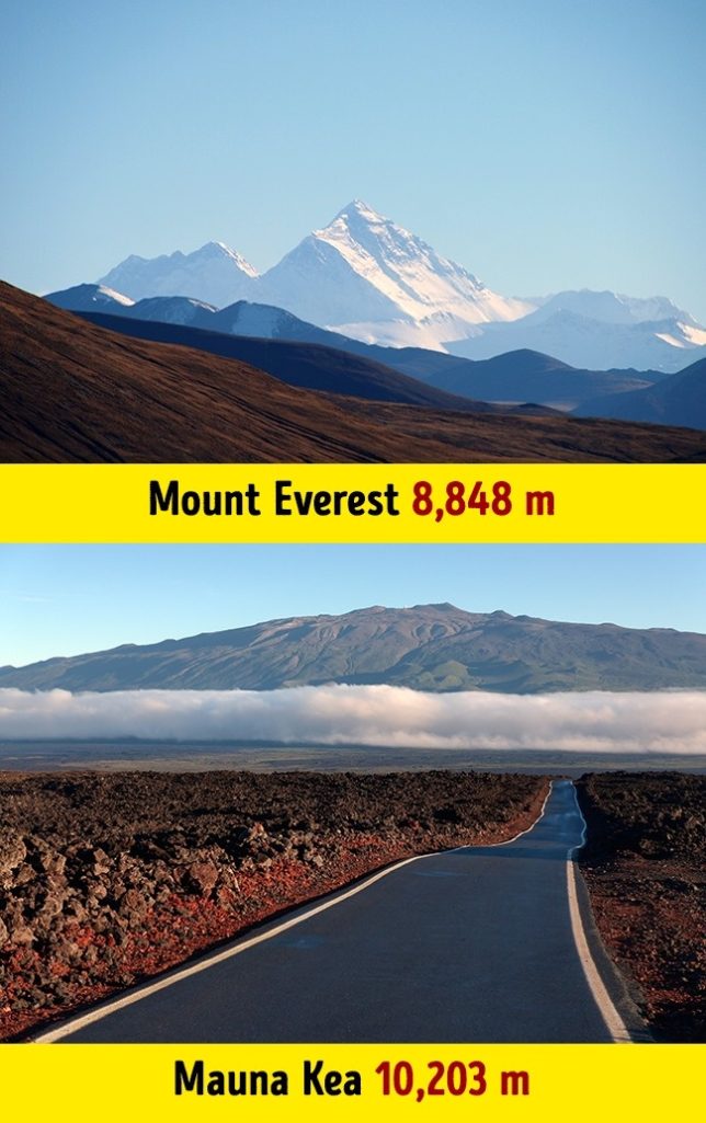 最高的山是夏威夷的毛纳基火山,它浮出水面的高度只有4,205米,但其实这座火山大多数都在海底下,所以如果从底部算起的话,毛纳基火山还要比圣母峰还要高1,355m。