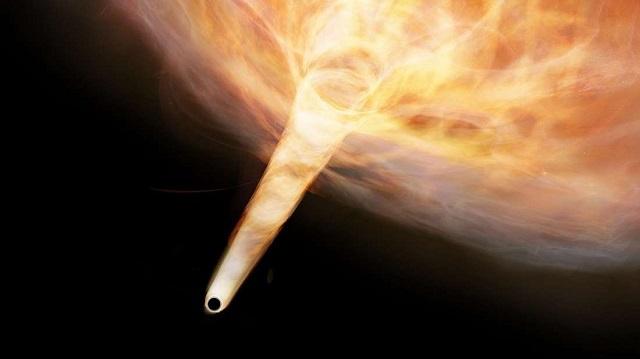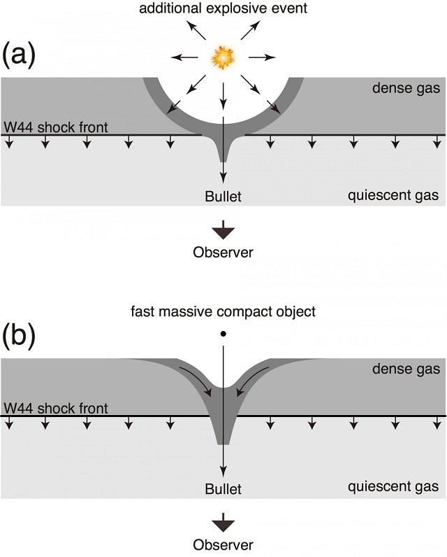 研究人员将这一神秘的现象称为“子弹(Bullet)”,并提出了两种解释方案,且两者都涉及了黑洞。第一种情形为一片受到恒星爆炸作用而快速膨胀的气体云从一颗安静的黑洞旁边掠过。这颗黑洞的质量大约只有太阳的3.5倍,刚好足以把气体云拉扯过去,并将其加速到观测到的速度。第二种情形则需要一个大10倍的黑洞,这个怪物从气体云中穿越而过,拖着一条长长的尾迹。