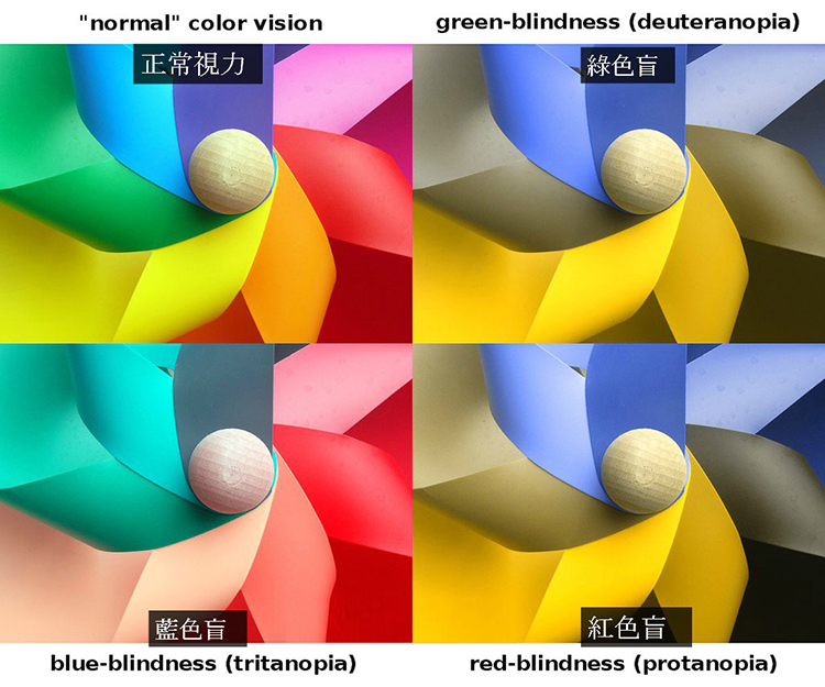 正如你所看到的,对于有红绿色缺陷的人来说,某些颜色看起来完全不同,通常会是泥泞、棕色的色彩。这使得无法区分紫色与蓝色,而粉红色可能根本不存在。