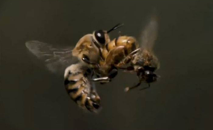 雄蜂交配时,生殖器会爆炸,导致死亡。蜂后婚飞时会跟数个雄蜂交配,并留下一整群没JJ的雄蜂尸体。