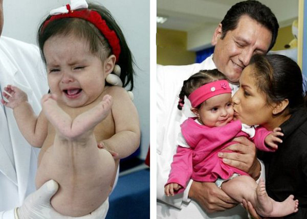2005/2006年,秘鲁的小美人鱼病例——2岁女孩Milagros在先后两次手术后医生分离了他的小腿和膝盖。