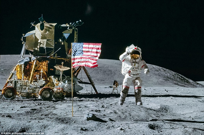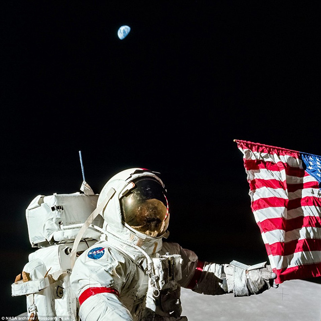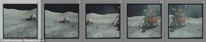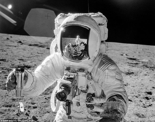 阿波罗任务中的大量图片都是由宇航员本人拍摄的,所用器材是绑在他们胸前的哈苏相机。这张拼接图片显示的是阿波罗12号任务时的场景,可以看到宇航员面罩上的清晰投影。