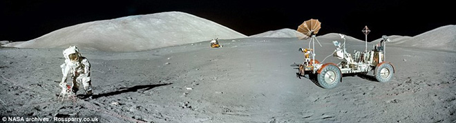 根据宇航员在登月任务中对周围情况的详细描述,成功地将不同的画面用软件拼接到一起。这张图片的素材来自阿波罗17号任务。阿波罗计划的档案于1999年建立,借助高解析度扫描仪,所有的图片都转换为数字形式。每张图片的平均分辨率达到16MP,非常适合放大和编辑。