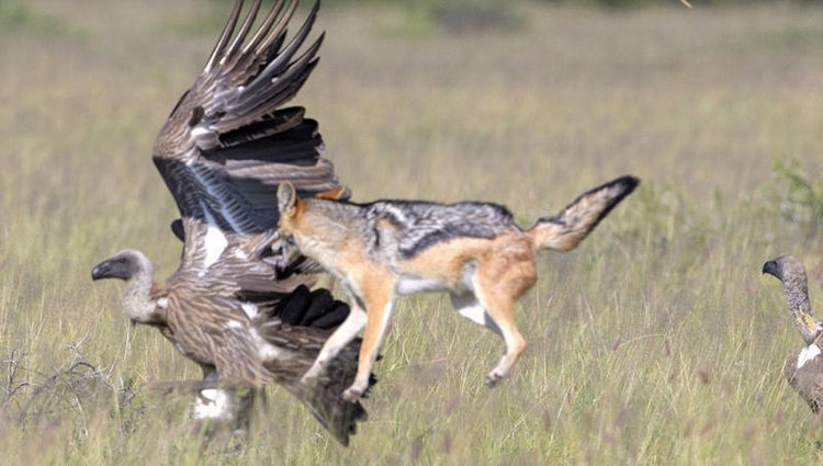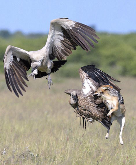 照片中,一只豺狼克服重力,跳跃至空中,搏击秃鹰。饥不择食的秃鹰露出利爪,直扑豺狼的猎物。