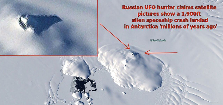 一位俄罗斯外星阴谋论者认为,这些卫星影像揭露了一艘可能坠毁于南极洲的巨大外星太空船残骸。
